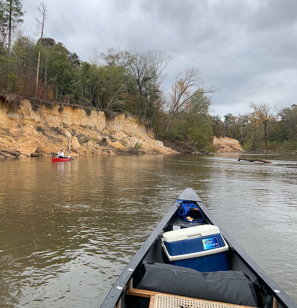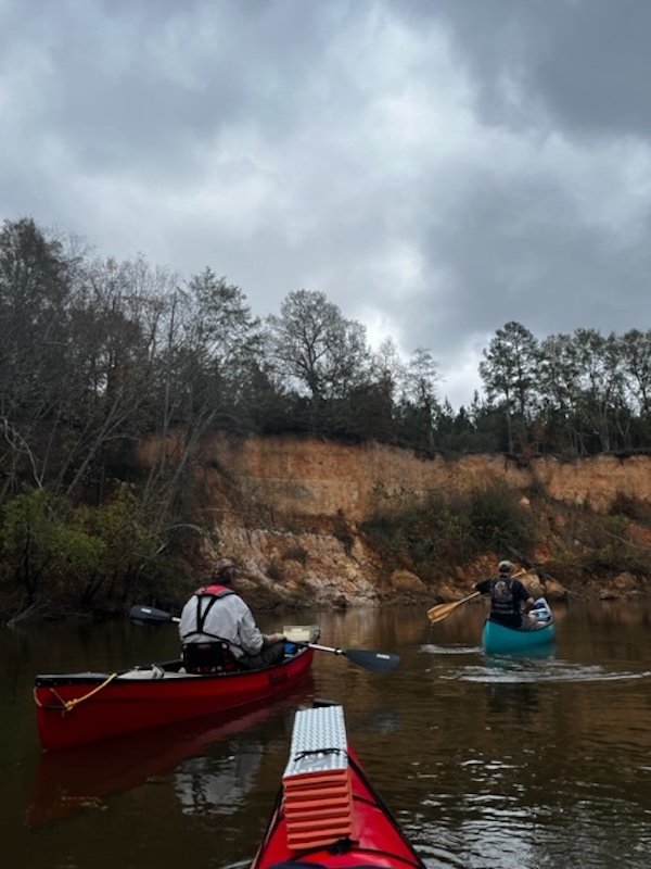 Flint River Sandbar: Seven GWS paddlers in four canoes and one kayak journeyed 33 miles on the Flint from Hwy 128 west of Roberta to Free Ferry on November 16-18, 2023. The trip had to be relocated downstream from the originally planned PoBiddy section due to low water, and even the navigability of this lower section was in doubt until a mere quarter inch of rain in the watershed a few days earlier, combined with the fall dormancy of trees, more than doubled the Flint’s water volume from 450 cfs.