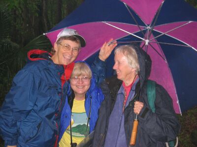 It did rain a bit on us.....ok, so it rained a lot on us....but that did not stop us from hiking and enjoying the place. Bonnie, Corky, and Sue all are still smiling as you can see.